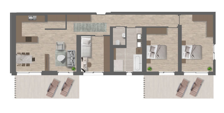 Top 2 in Haus 1 im 1. OG: 4 Zimmer, ca. 101 m² Wohnfläche und eine ca. 31 m² große Terrasse/Balkon in Nord/West-Ausrichtung. Durchdachter Grundriss mit Bad und separatem WC sowie Abstellraum.