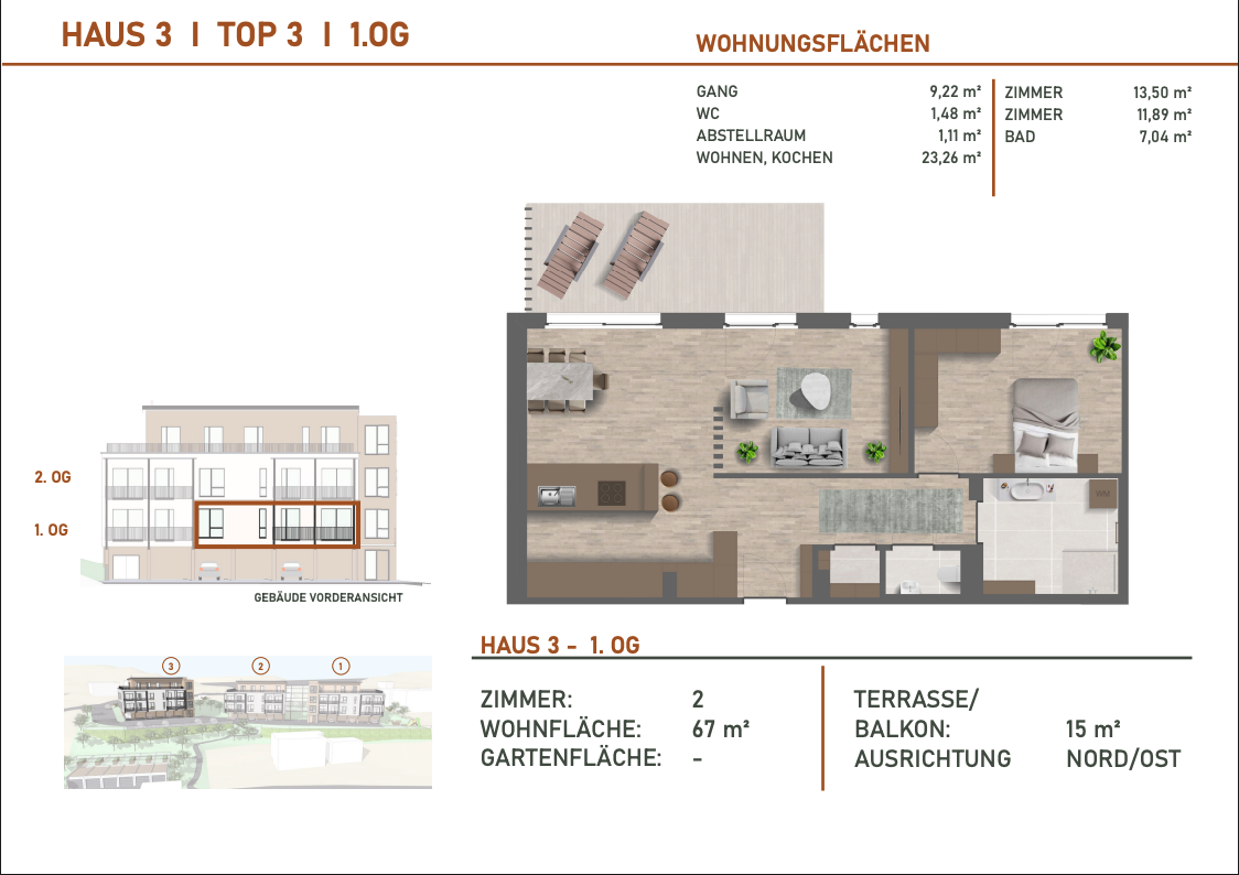 Top 3 in Haus 3: 67 m² Wohnfläche, 3 Zimmer, offener Wohn-/Kochbereich (23,26 m²), Bad, separates WC und Abstellraum. Balkonfläche 15 m², Ausrichtung Nord/Ost.